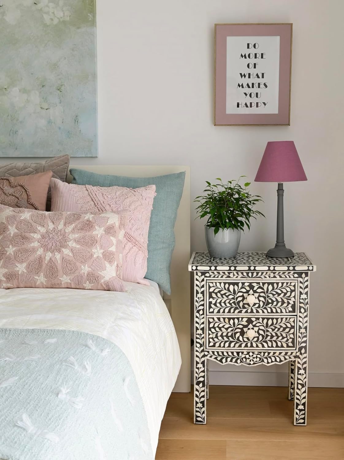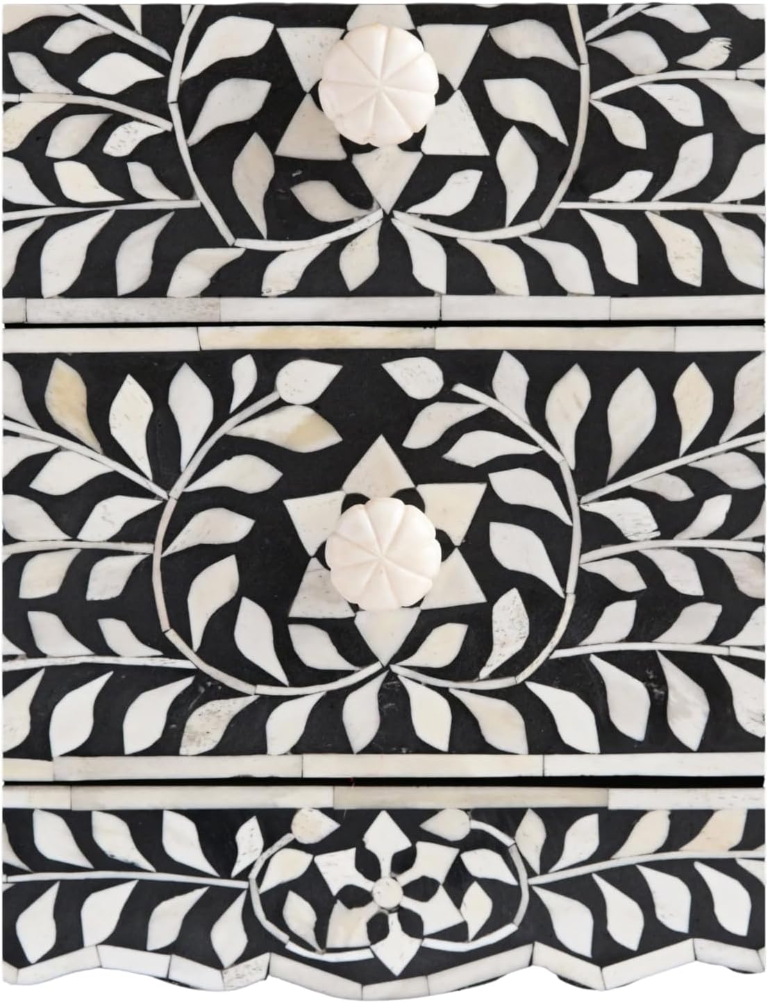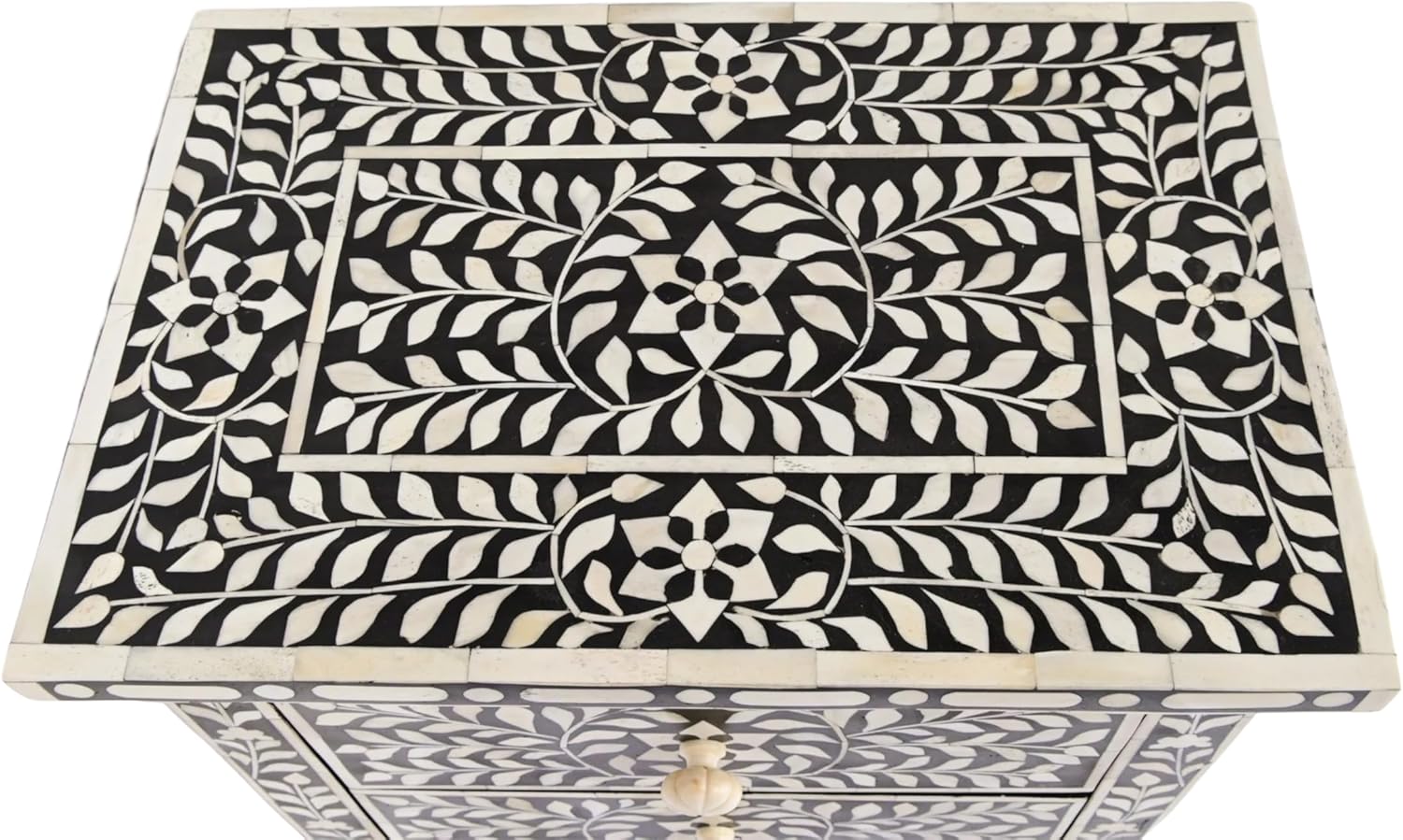 Bone Inlay Bedside Table with 2 Drawers Handcrafted Nightstand with Detailed Floral Design Stylish and Functional Accent Furniture for Bedroom or Living Room Storage and Décor