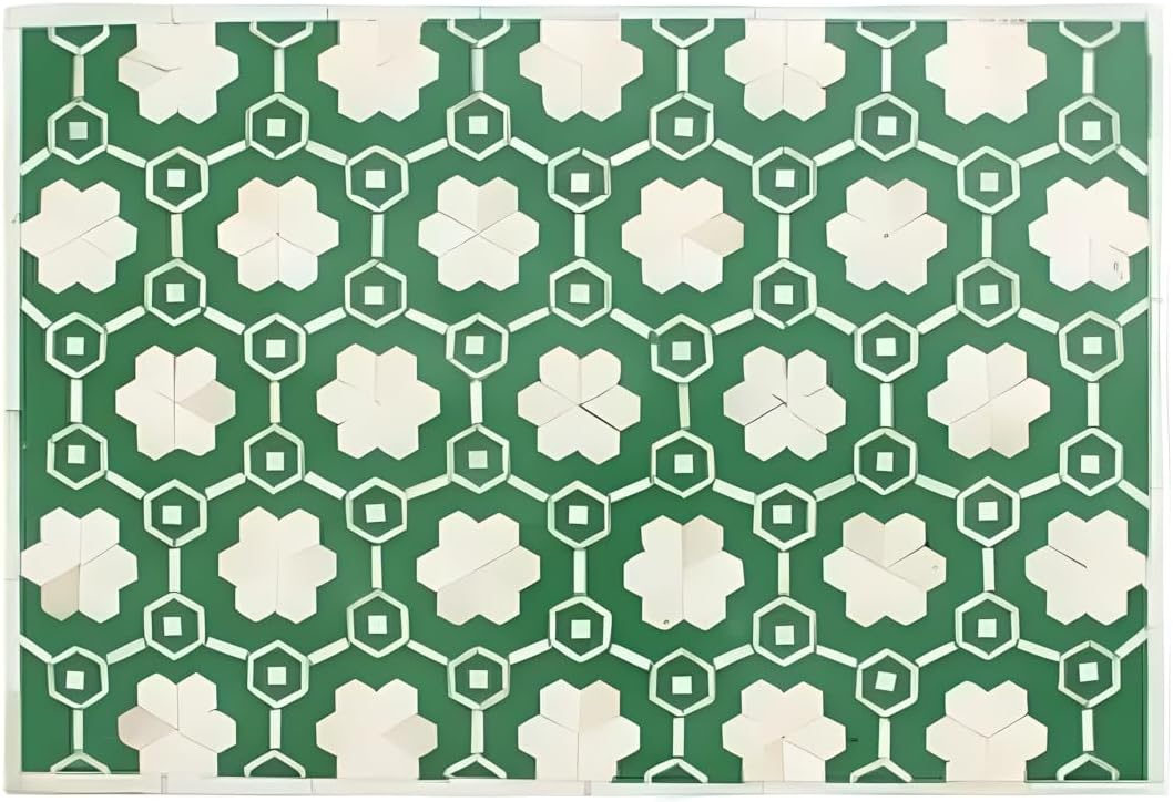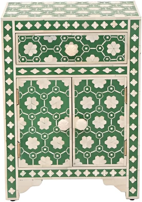 Bone Inlay Bedside Table with 2 Drawers Handcrafted Nightstand with Storage Elegant Floral Design Accent Furniture for Bedroom, Living Room or Entryway Décor