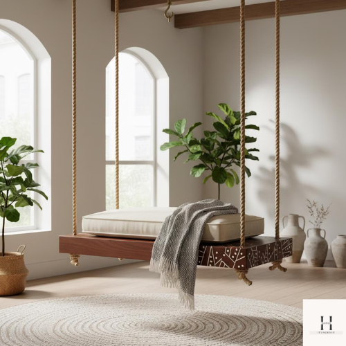 Handmade Wooden Rope Swing with White Inlay – Modern Jhula | Hansa Handicraft